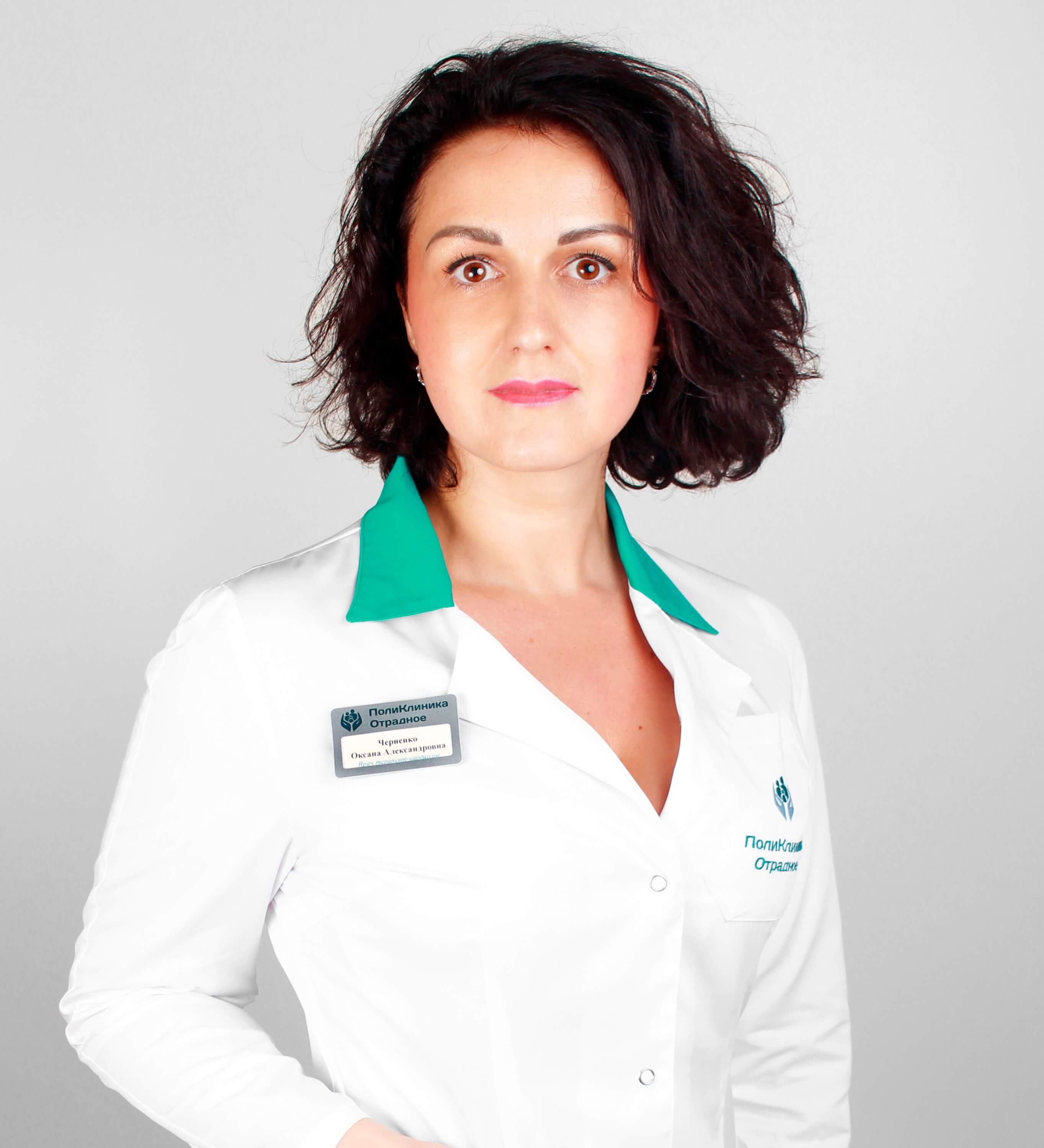 Черненко Оксана Александровна-прекрасный врач, профессиональный и внимательный. Много лет мы с мужем обращаемся к ней со своими проблемами и всегда получаем кроме квалифицированной помощи, очень человеческое и душевное внимание. Мы ее любим и полностью ей доверяем.